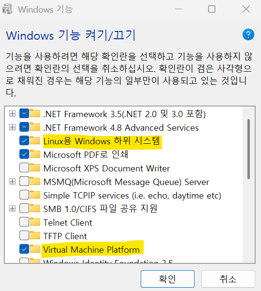 windows 기능 켜기/끄기 제대로 보여서 -> 아래 두 항목에 체크했다.