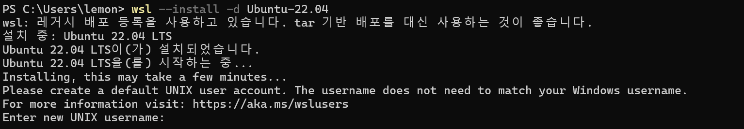 Ubuntu 환경으로 다시 진입하려면: wsl -d Ubuntu-22.04