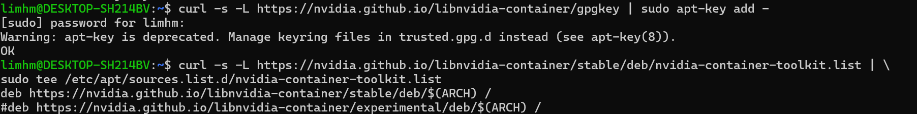 curl -s -L https://nv> idia.github.io/libnvidia-container/gpgkey | sudo apt-key add - && \