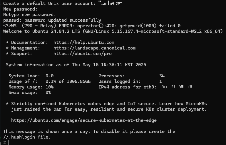 -> Ubuntu 셀 프롬프트 입력 가능해짐 (초록색 텍스트가 생김)
