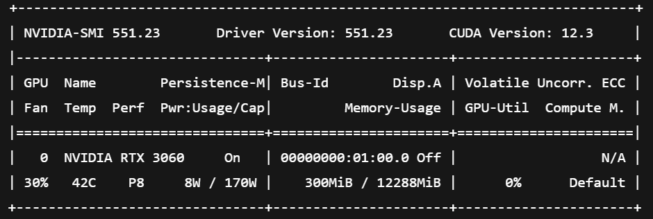 결과 화면이 아래와 같이 나타나면, NVIDIA 드라이버가 잘 설치되어 있고 GPU도 잘 인식되고 있는 상태라는 것이다. 만일 아래 화면처럼 안 뜨고 오류가 발생한다면, 설치가 안되어있거나 문제가 있는 것이다.