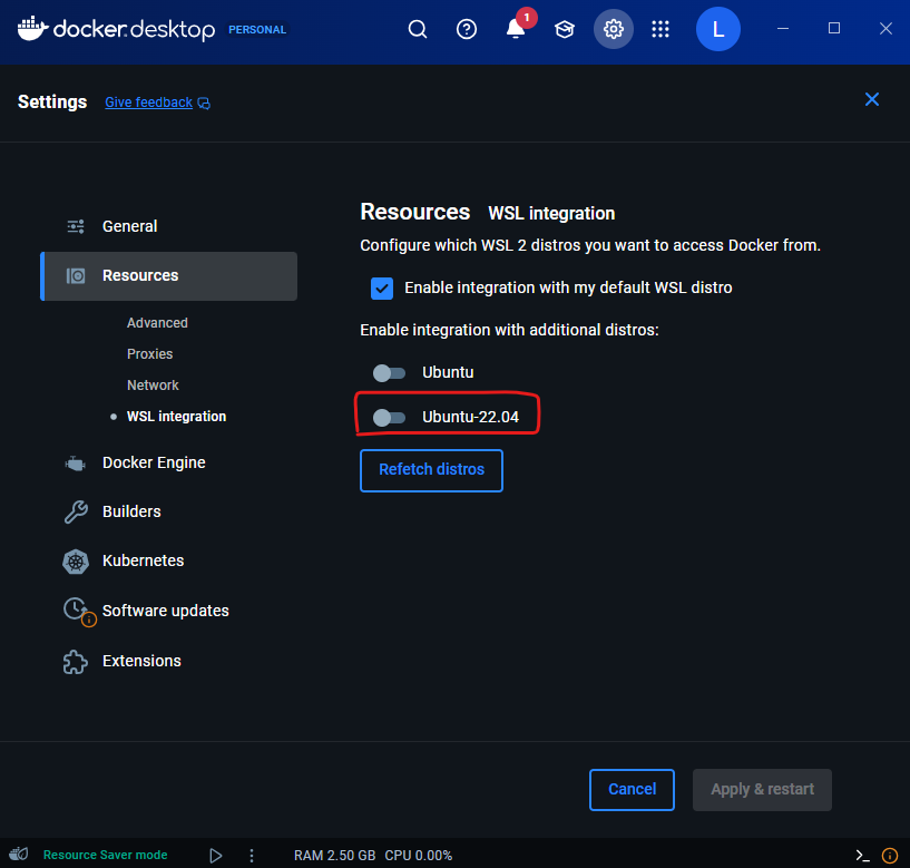 [해결 방법] Docker Desktop에서 Ubuntu-22.04와의 연동(Wsl Integration)을 켜주어야 함.