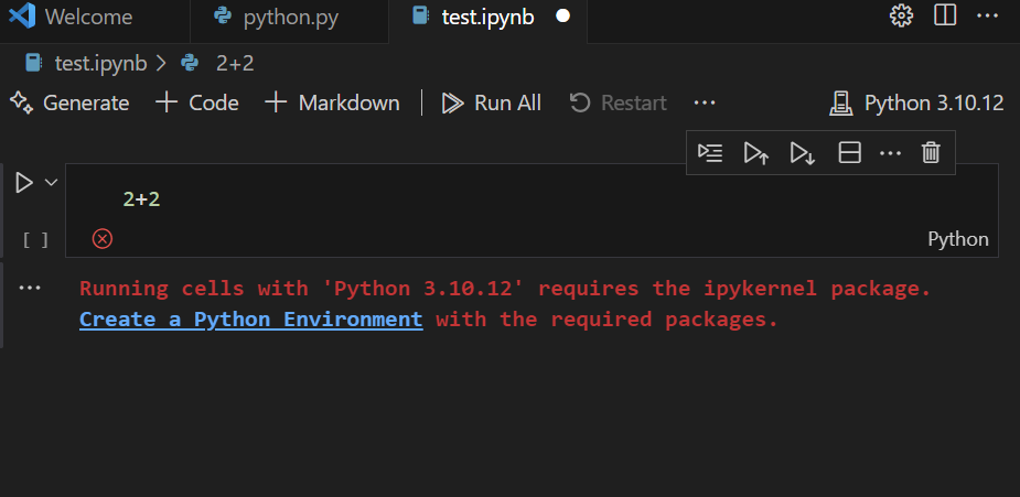 오류 메시지의 뜻은 ipykernel이라는 패키지가 설치되지 않아서 Jupyter 셀을 실행할 수 없다는 것..!