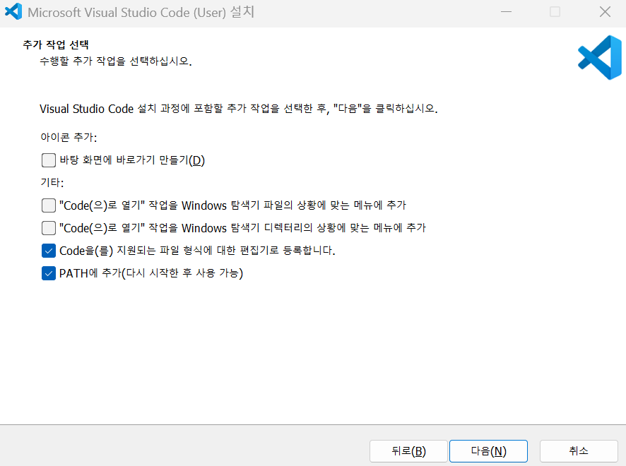 - 기본적으로 체크되어 있는 두 항목은 그대로 두고 다음을 누른다. 특히 "PATH에 추가"는 반드시 체크!