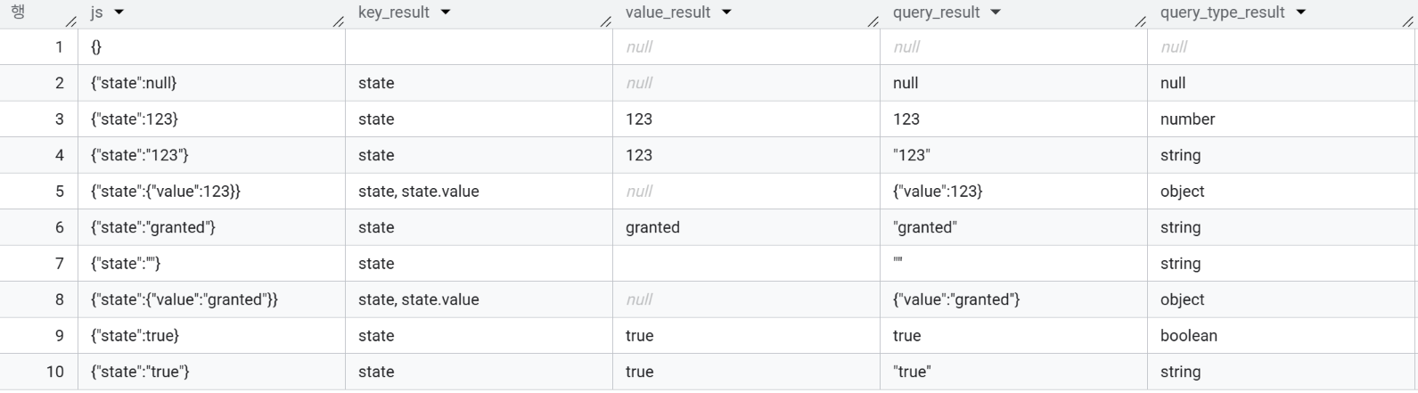 - 반환되는 건 JSON 자체가 아니라, 그 타입 이름이 문자열(SQL STRING)로 나오는 것임.
