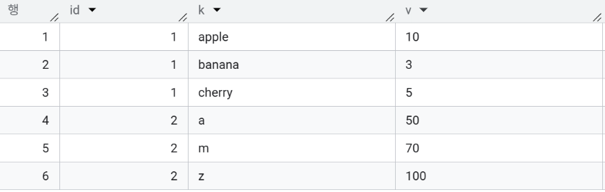 - GROUP BY id를 통해 다시 하나의 데이터로 모으면서, STRING_AGG 함수 내부의 ORDER BY k 옵션을 사용해 키(k)를 알파벳 순서로 정렬하며 이어 붙인다.