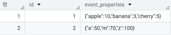 SELECT 1 AS id, JSON '{"banana": 3, "apple": 10, "cherry": 5}' AS event_properties